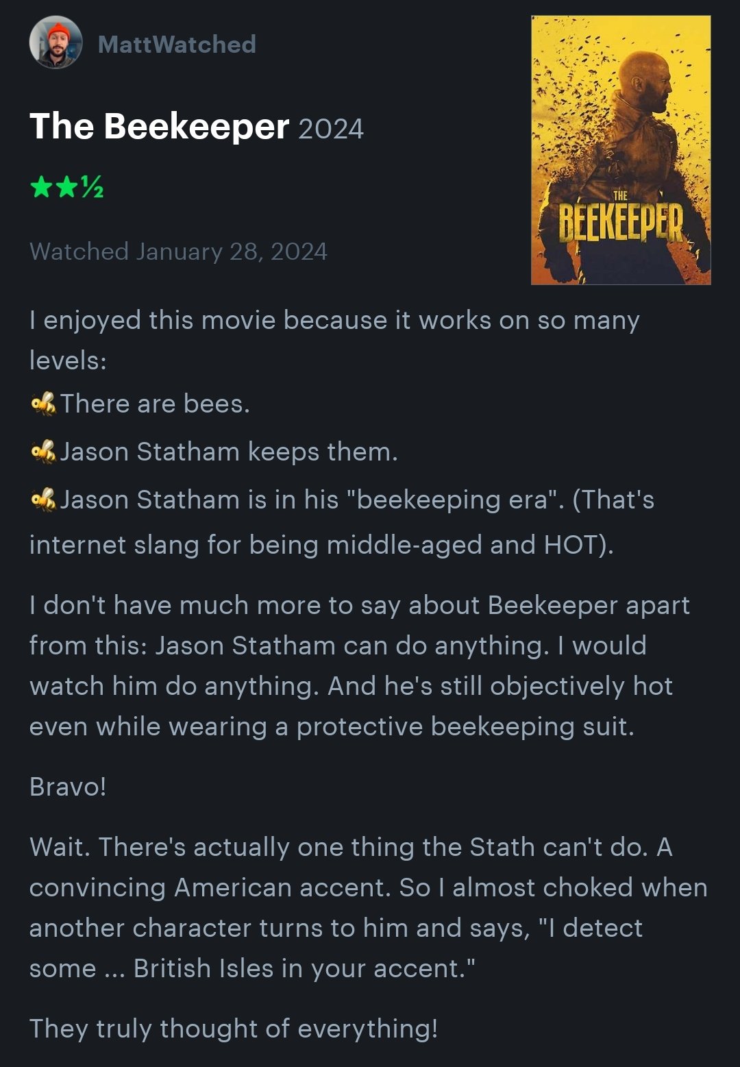 Source : m.facebook.comMatt Nelson on X: “The 🐝Beekeeper🐝 starring Jason Statham is THE